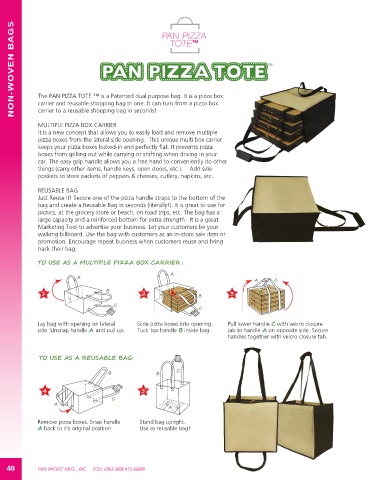 NON-WOVEN BAGS PLASTIC BAGS PLASTIC BAGS The PAN PIZZA TOTE ™ is a Patented dual purpose bag. It is a pizza box