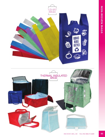 T T-SHIRT-SHIRT BAGSGS BA PLASTIC BAGS PLASTIC BAGS NON-WOVEN BAGS THERMAL INSULATEDNNNSULATEDNSULATED BAGSGSSS PAN PACIFIC MFG., INC. TOLL FREE 888.475.6888 43