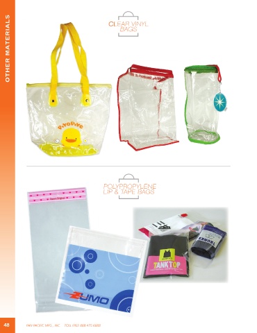 OTHER MATERIALS PLASTIC BAGS PLASTIC BAGS CLEAR VINYL CLEAR VINYL BA BAGSGS POL POLYPROPYLENEYPROPYLENE LIP & T LIP & TAPE BAGSAPE BAGS 48 PAN PACIFIC MFG., INC. TOLL FREE 888.475.6888