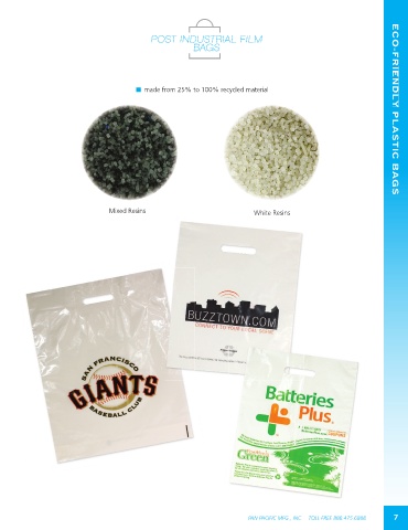 POST INDUSTRIAL FILM ST INDUSTRIAL FILM PO BA PLASTIC BAGS BAGSGS made from 25% to 100% recycled material ECO-FRIENDLY PLASTIC BAGS PLASTIC BAGS Mixed Resins White Resins PAN PACIFIC MFG., INC. TOLL FREE 888.475.6888 7 7