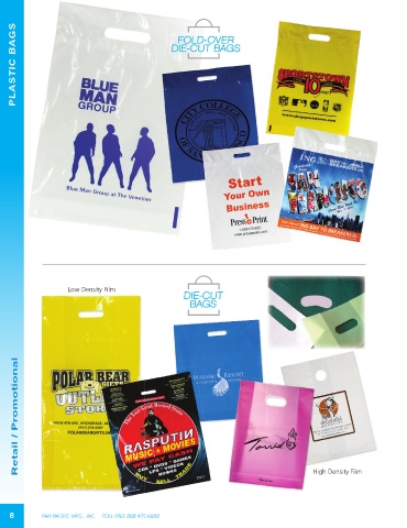 PLASTIC BAGS DIE FOLD-OVER OLD-OVER F DIE-CUT BAGS-CUT BAGS Low Density Film DIE DIE-CUT -CUT BA BAGSGS Retail / Promotional H High Density Film 8 PAN PACIFIC MFG., INC. TOLL FREE 888.475.6888
